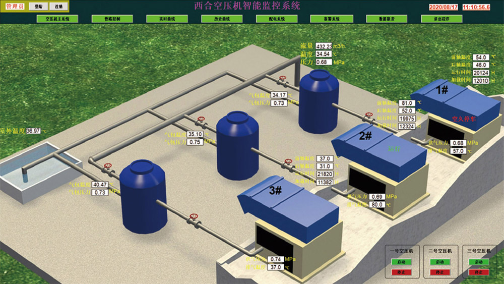 模拟动画实时仿真监控压风机房的内/外部运行状态,有图表、曲线等多种方式显示压风机的运行参数和运行趋势。