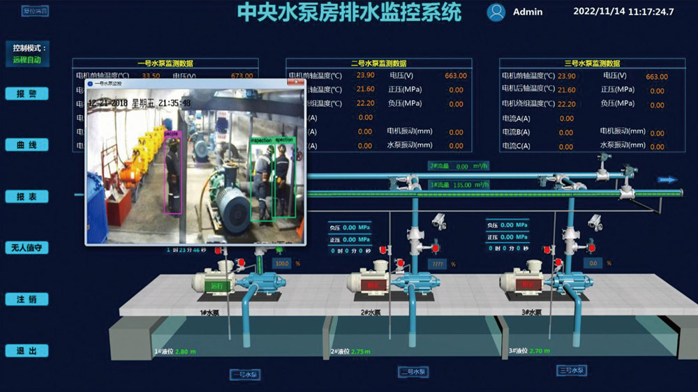 系统具有水仓水位、流量、压力(含管路压力、真空泵负压等)、设备温度(水泵轴承温度,由机绕组及轴承温度等)、电流、电压、功率等模拟量采集、显示及报警功能。