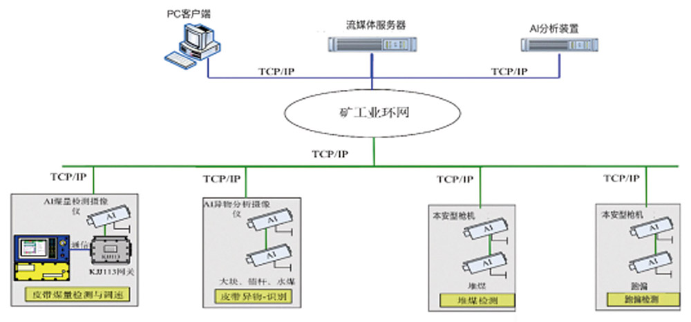 系统主要由全煤流分析平台、Al分析装置、流媒体服务器、客户端主机、煤流摄像仪,大块异物摄像仪、普通本安摄像仪、激光器、恒流源灯、热成像摄像仪等组成。