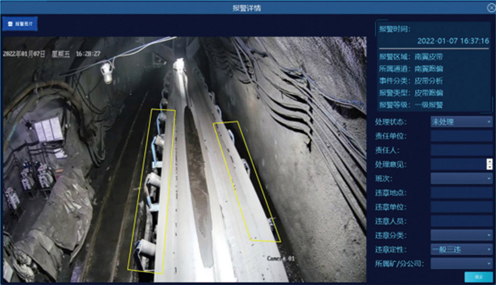 通过大块异物摄像仪实时抓拍皮带上的异物、锚杆和水煤,并根据报警的级别进行分类,并将报警信息写入到数据库内,通过客户端可以进行分类统计。
