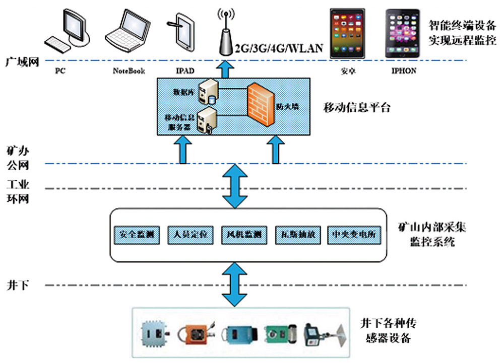 矿山企业综合信息移动发布系统通过煤矿现有的信息系统,采集煤矿生产、安全及经营管理的信息,实现煤矿生产各系统的远程、实时、多级联网,能够实时、直观的反映矿井的运行状态,并通过互联网将数据延伸至手机端查询。矿井管理及技术人员可以在任何时间、地点通过移动终端联网实现对矿井的远程监控和全方位综合监管。