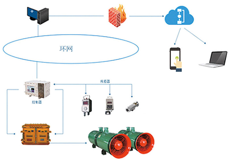 风电闭锁:当局部通风机停止运转,切断被控区域全部非本质安全型电气设备电源并闭锁(局部通风机电源除外);当局部通风机恢复运转,允许恢复向被控区域供电。