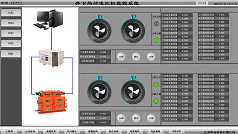 风机在线监控系统由上位机、防爆PLC控制柜、数据采集传感器、视频、交换机等系统组成。分别在调度室配置一台上位机,在局扇控制开关附近分别布置一台矿用隔爆兼本质安全型PLC控制柜。